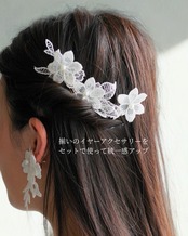 玉ねぎヘアやハーフツイン、ポニーテールにもアレンジ自在で、ショートヘアの方にもぴったり。ブライダル ヘッドドレスとしてはもちろん、ガーデンウェディングやフォトウェディングにもおすすめの、ナチュラル ウェディング ヘア小物です。上品さと可愛らしさを両立した、やわらかな存在感が魅力です。