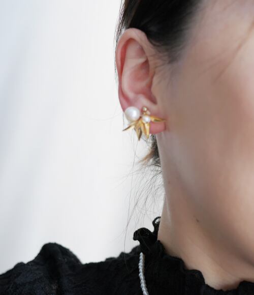 繊細なゴールドのミニフラワーに、小さな淡水パールを添えた上品なアクセサリー。