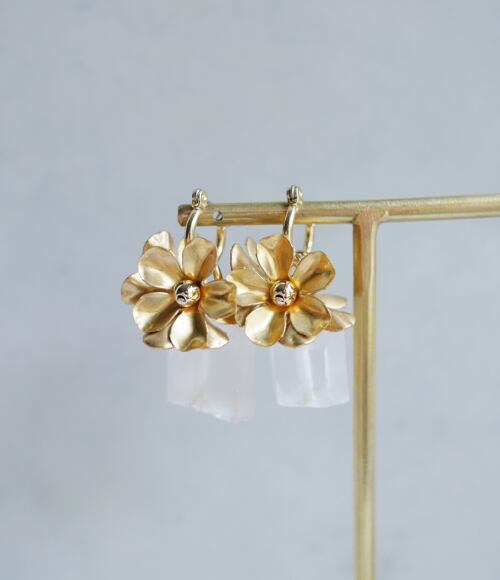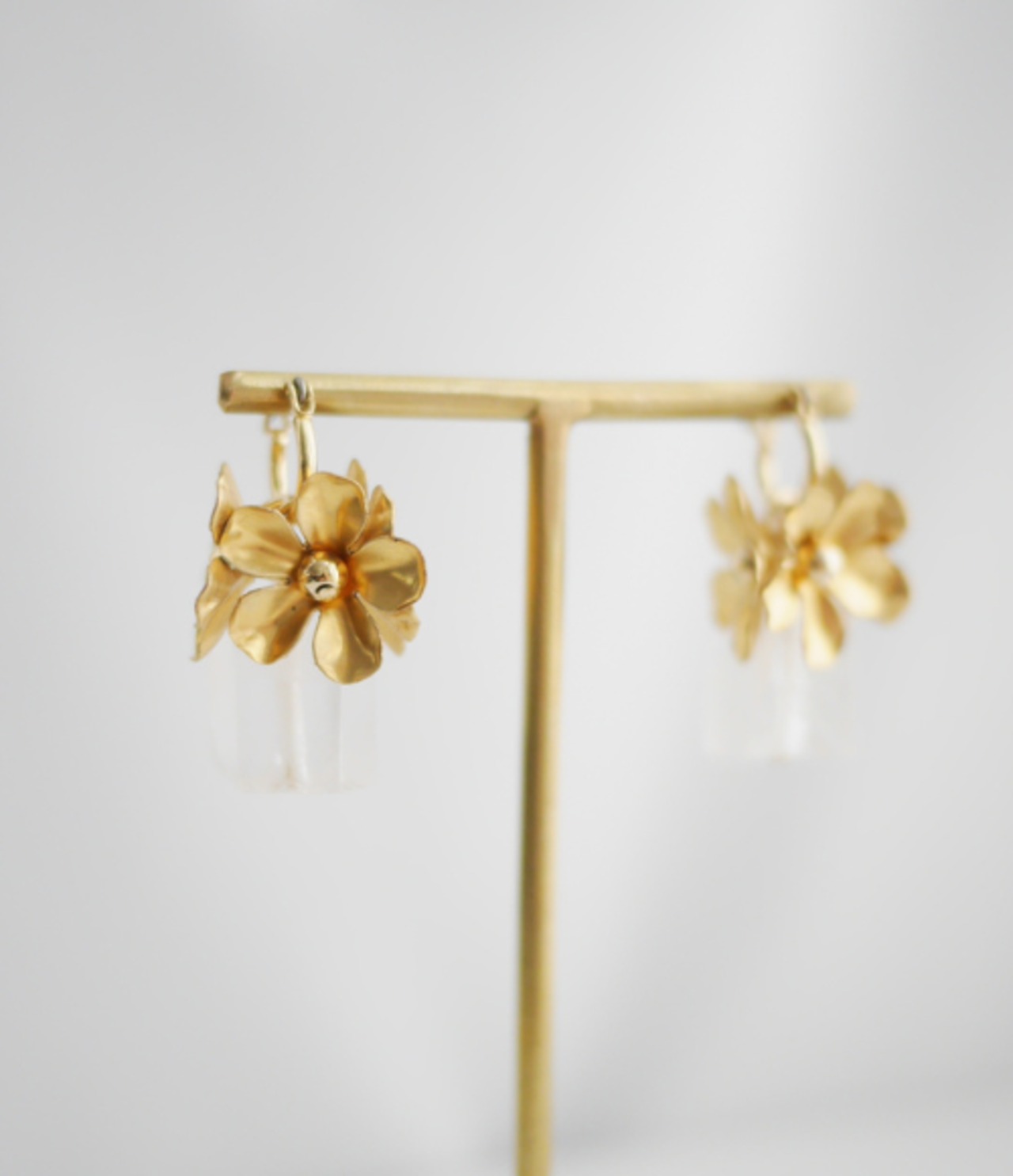 半透明の大ぶりクリスタルとゴールドのミニフラワーが繊細に組み合った、華やかで洗練されたアクセサリー。 ピアスは4way、イヤリングは2way仕様で、シーンに合わせて自由にアレンジできます。